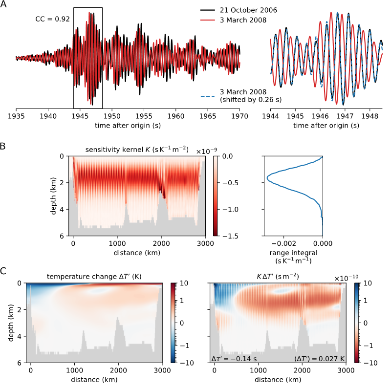 地震T波是海区地震激发的弹性波在海底转换而成的水声波,可以在海洋SOFAR通道中长距离传播,其传播时间可以敏感地反映海水声速,从而用于可靠地反演海水温度变化。该地震学团队在2004年印尼大地震之后,召开了地震T波、定点持续噪声源、地震背景噪声等与海洋有关的研究。该团队对苏门答腊地区的大量地震波形进行了分析,发现了丰富的重复地震事件。在此基础上,他们准确测量了一系列重复地震的T波到时微弱变化,重构了2005-2016年期间T波到时变化的时间序列;基于先进的地震波传播算法,计算得到了T波对海水温度变化的敏感核函数,对比已有物理海洋学的观测与大洋环流模式,验证了该方法的可靠性,并取得了赤道东印度洋深层海水温度随时间变化的特征。该项研究揭示了赤道东印度洋的深层海水温度存在准双周、半年和年周期等变化,而且新方法测量得到的温度存在十年的线性增长趋势,明显高于以前的研究结果。该方法可以利用已经积累的大量T波资料,取得过去几十年大洋深处海水温度变化特征,从而为全球气候变化研究给予新手段。