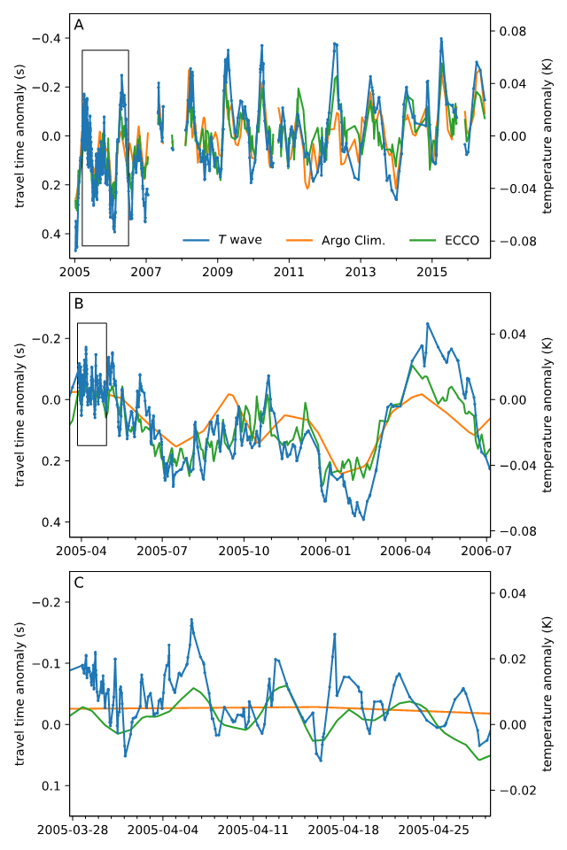 气候变化是公众及学者高度关注的问题。大气中二氧化碳等温室气体浓度的上升,导致了气候系统中热量增加(excess energy),而海洋吸收了其中90%以上的热量,因此海洋在气候变化中起到关键的作用。然而,深层海水温度实测资料严重不足,人们对于海洋深处的温度变化特征分析十分有限,这制约了科学家对长期气候变化的深入认识。针对此难题,美国加州理工学院地震学实验室博士吴文波、助理教授詹中文以及Ezpay大地测量与地球动力学国家重点实验室研究员倪四道三位地震学者提出了利用地震T波测量深海温度变化的新方法,在与物理海洋学家合作的基础上,取得了2005-2016年期间的赤道东印度洋深层海水温度多时间尺度的变化特征。该方法为物理海洋学及气候变化研究给予了新手段。相关研究发表在国际学术期刊《科学》(Science)上。