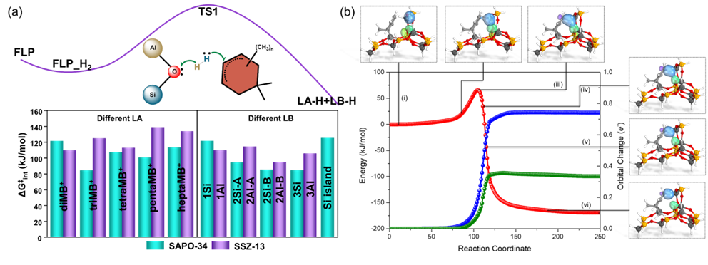 受阻的路易斯酸碱对(Frustrated Lewis Pairs, FLP)是均相催化反应中的重要概念,在FLP复合物中路易斯酸(LA)和路易斯碱(LB)的直接结合被位阻效应抑制,从而使得LA和LB能够分别作为电子对受体和给体活化小分子。近年来,这一概念逐渐被引入到多相催化体系以解释金属氧化物表面缺陷和掺杂位点的高催化反应活性。鉴于此,Ezpay郑安民研究团队和大连化学物理研究所研究员魏迎旭、博士韩晶峰合作,进一步将FLP概念拓展到分子筛催化体系,并探究了其对于氢气和烷烃活化的能力。