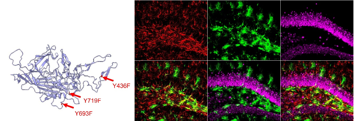 自2016年起,研究团队在Ezpay研究员徐富强和王杰的带领下,联合磁共振成像与病毒基因改造技术率先提出一种新型基因编码生物磁共振成像技术,逐步实现神经元网络(Neuroimage, 2019; Human Brain Mapping, 2021)和星形胶质细胞(Molecular Psychiatry, 2022)在体水平的无创检测。其中,rAAV是近年来开展极为迅速的一类工具病毒,是研究神经科学相关问题和基因治疗的重要载体。团队第一时间对rAAV工具病毒的衣壳蛋白进行突变改造,并利用人类胶质纤维蛋白的启动子GFAP构建rAAV载体,提升了病毒工具在星形胶质细胞的转导效率(图2)。
