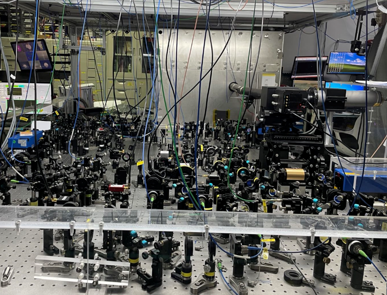 超冷40Ca+离子实验平台,囚禁离子的离子阱处于磁屏蔽装置(照片后方银白色的金属箱子)保护中。其余的光学设备用以辅助激光系统操作离子,完成量子热机所需的各个冲程