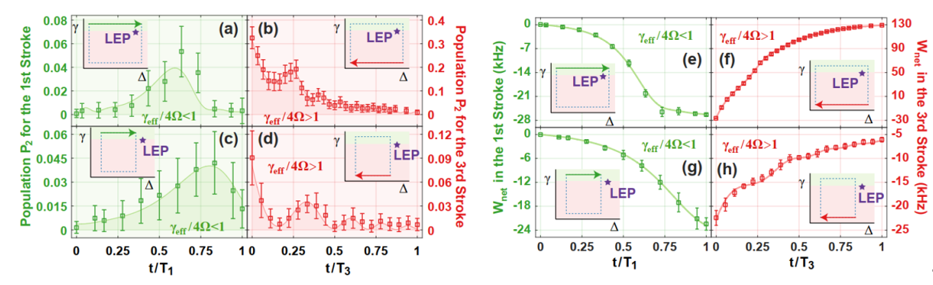 实验数据及其对应的输出净功变化。(a,b)环绕奇异点的等耗散冲程所对应的激发态布居数随时间的变化。(c,d)不环绕奇异点的等耗散冲程所对应的激发态布居数随时间的变化。(e,f)环绕奇异点的等耗散冲程所对应的净功变化。(g,h)不环绕奇异点的等耗散冲程所对应的净功变化。图中,绿色线条和阴影区域代表处于破缺相的等耗散压缩,红色线条和阴影区域则代表处于严格相的等耗散膨胀