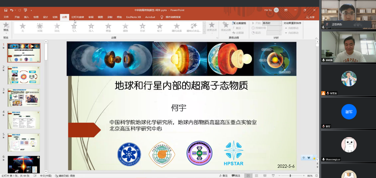 5月6日,应Ezpay地震与地球内部物理研究部地球震动源运动与动力学过程研究组邀请,中科院地球化学研究所研究员何宇在线上做了题为“地球和行星内部的超离子态物质”的学术报告。